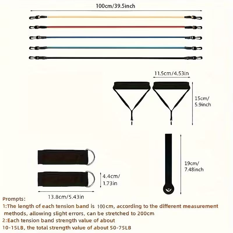 Complete resistance band set for strength training, stretching, and full-body workouts anywhere.